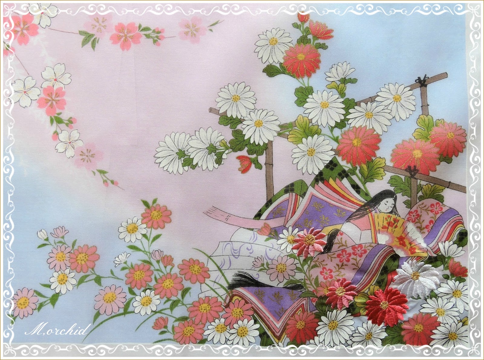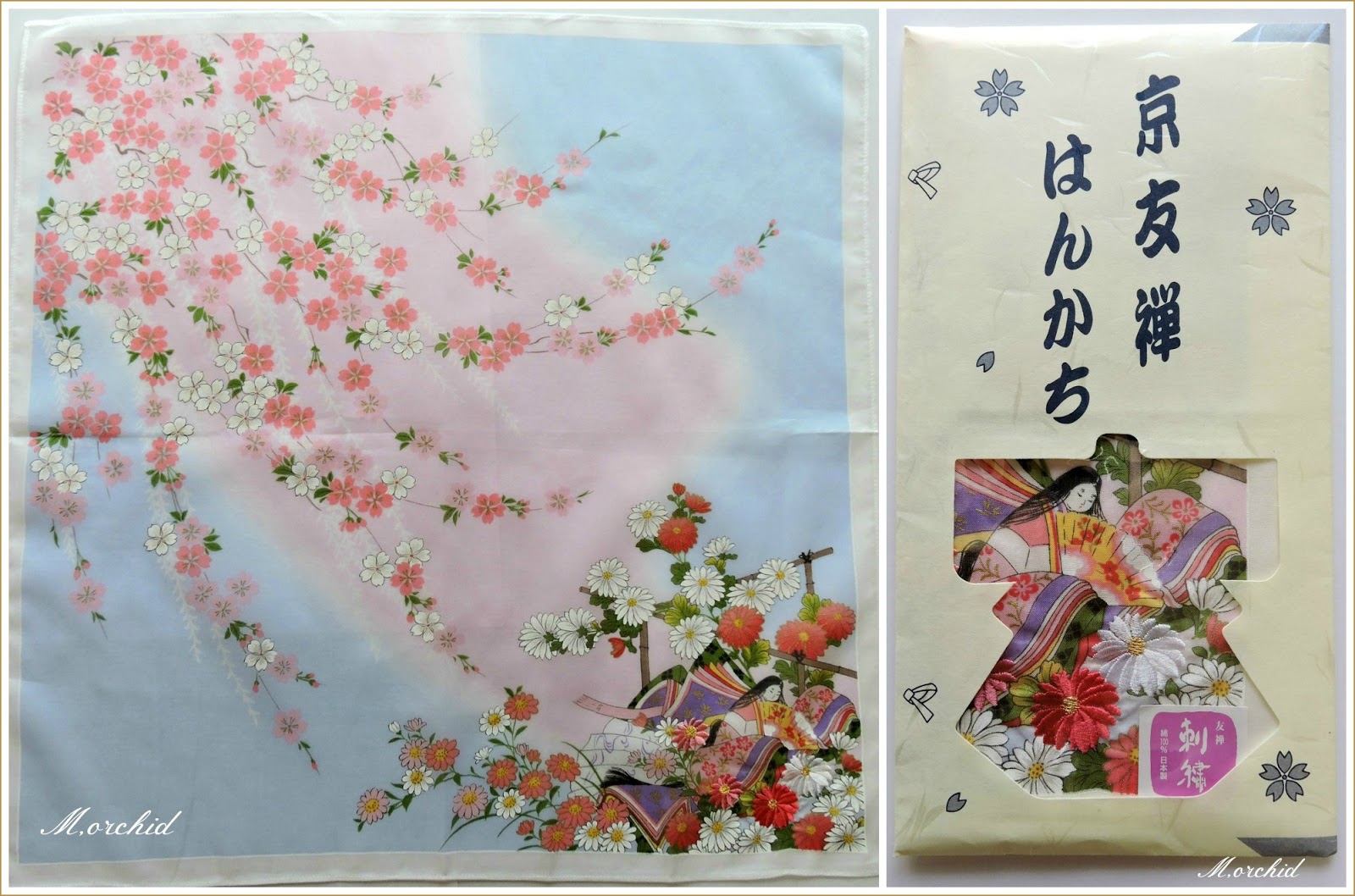 This Tue. I visited my aunt and cousins to thank them for their get-well visits to the hospital last month. One of my cousins had been to the trip to Kansai and Kanto area after I've seen her at the hospital. This 'Kyo Yuzen Dyeing' Handkerchief with embroidery is the beautiful gift for me from her. And the lady is wearing 'Twelve-Layer Robe' (Wikipedia page. picture page) which is an extremely elegant and highly complex kimono that was only worn by court-ladies in the old days.